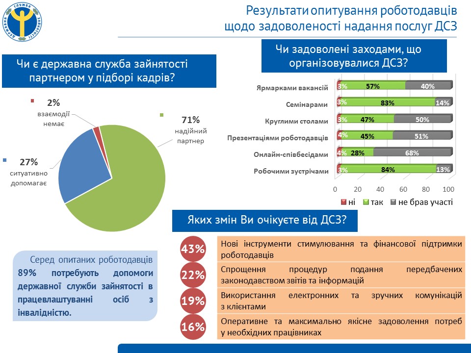 У червні державна служба зайнятості запропонувала роботодавцям взяти участь в опитуванні та висловити думки щодо співппраці зі службою зайнятості, розповісти про послуги, якими користувалися, а також надати пропозиції щодо очікуваного вдосконалення послуг служби зайнятості.