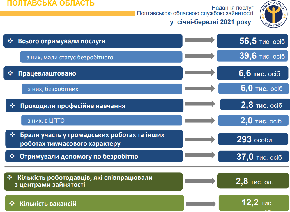 Послугами Полтавської обласної служби зайнятості протягом січня-березня 2021 року скористалися 56,5 тисячі громадян, які шукали роботу, з них 39,6 тисячі осіб мали статус зареєстрованого безробітного.