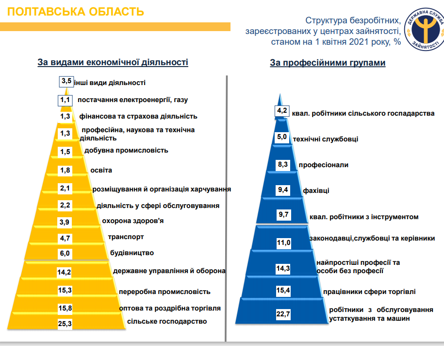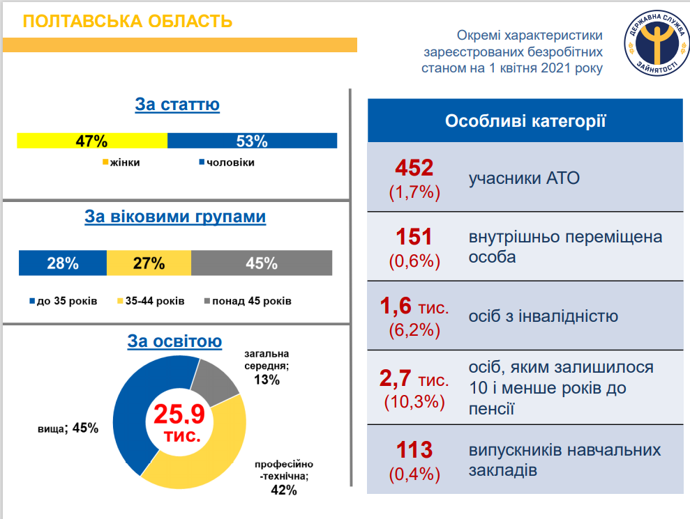 Станом на 1 квітня 2021 року послуги Полтавської обласної служби зайнятості отримували 41 тисяча громадян, з них 25,9 тисячі осіб мали статус безробітного, що на 27% більше, ніж на відповідну дату минулого року. Отримували допомогу по безробіттю 23,1 тисячі клієнтів служби зайнятості.