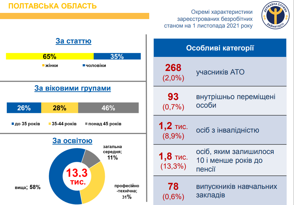 Станом на 1 листопада 2021 року послуги Полтавської обласної служби зайнятості отримували 13,3 тисячі безробітних. Це на 34% менше, ніж на відповідну дату минулого року.