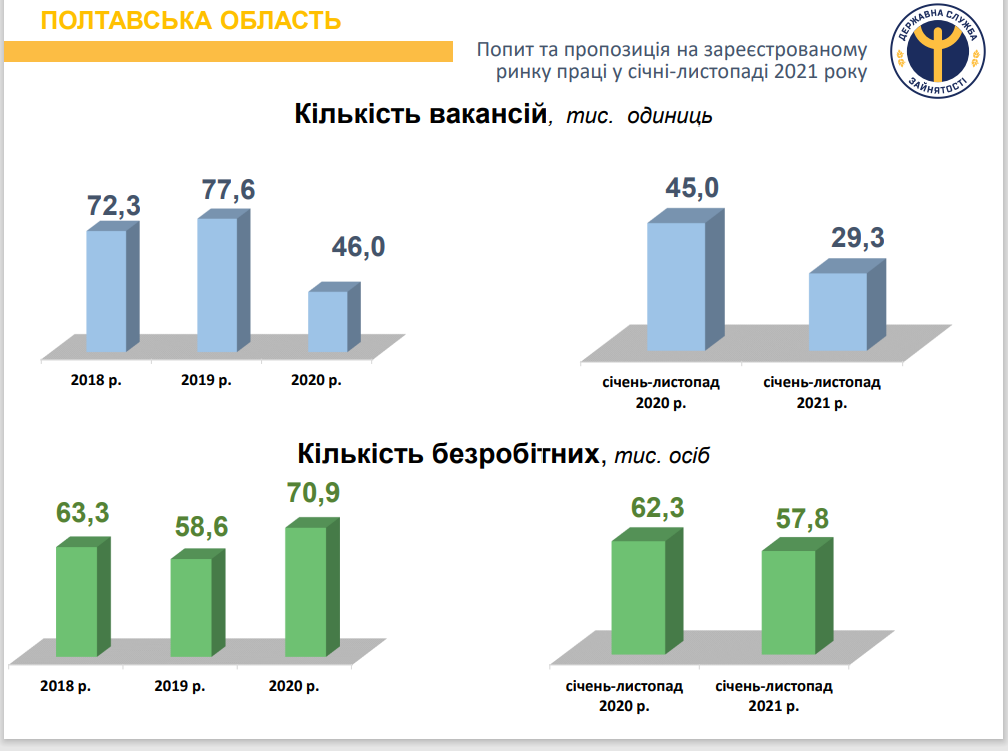 У січні-листопаді 2021 року роботодавці інформували центри зайнятості та філії Полтавської обалсті про наявність 29,3 тисячі вакансій.