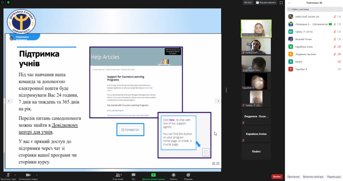 Зокрема відбулася відеоконференція на тему «Безкоштовне навчання безробітних громадян на курсах освітньої інтернет-платформи COURSERA» https://www.coursera.org/ .