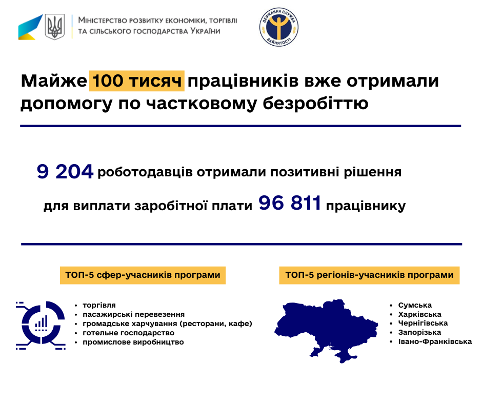 За інформацією Державного центру зайнятості, ТОП-5 сфер-учасників програми - це торгівля, пасажирські перевезення, громадське харчування (ресторани, кафе), готельне господарство та промислове виробництво.