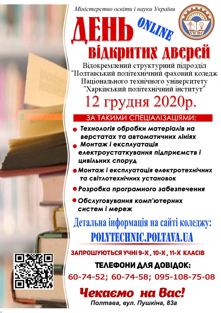 Відокремлений структурний підрозділ «Полтавський політехнічний фаховий коледж Національного технічного університету «Харківський політехнічний інститут» запрошує на День відкритих дверей, що відбудеться 12 грудня в онлайн-форматі.