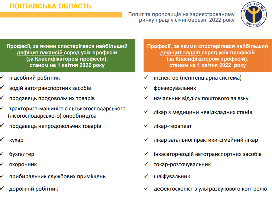 Водночас не вистачає кадрів: фрезерувальників, начальників відділів поштового зв'язку, лікарів медицини невідкладних станів, лікарів-терапевтів.