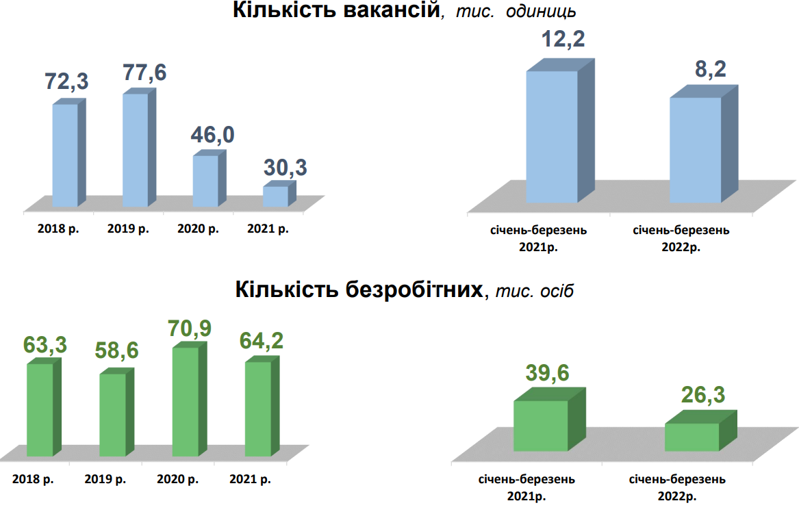 Станом на 1 квітня 2022 року роботодавці заявили до обласної служби зайнятості 1,9 тисячі вакансій, це на 44% менше, ніж торік на таку ж дату.