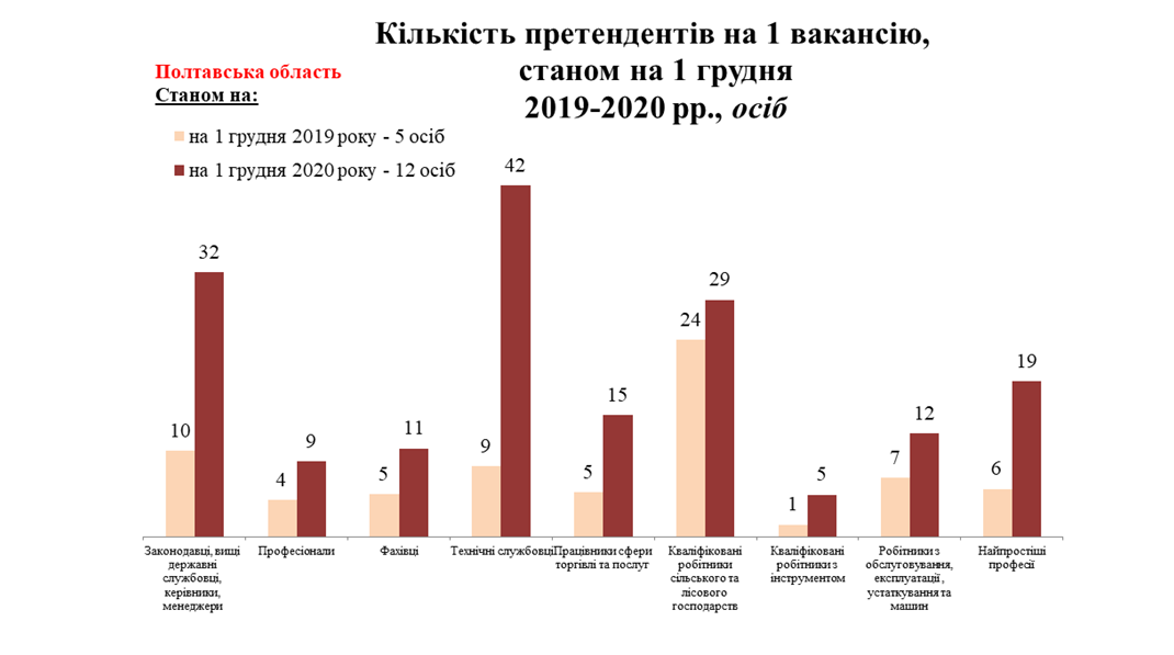 Станом на 1 грудня 2020 року на одну вакансію в середньому по Полтавській області претендувало 12 безробітних (станом на 1 грудня 2019 року – 5 осіб).