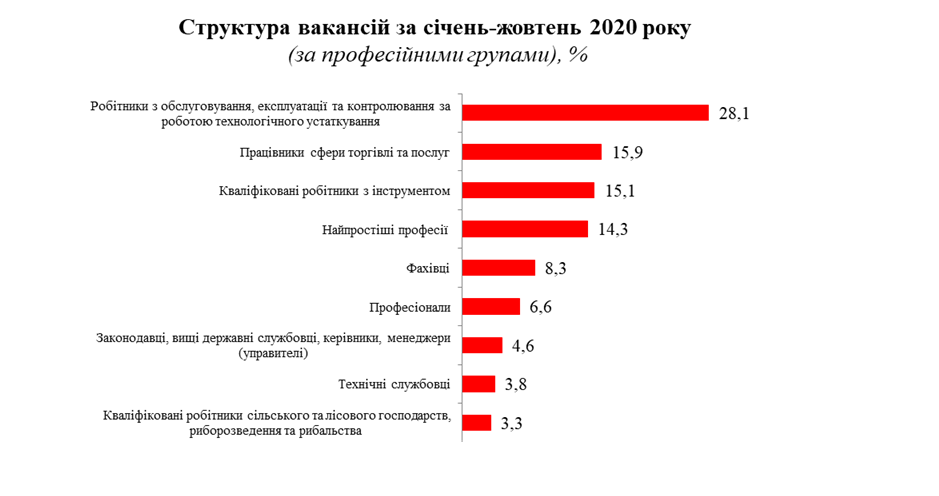 За професійними групами: найбільший попит роботодавців спостерігається на робітників з обслуговування, експлуатації та контролювання за роботою технологічного устаткування; на працівників сфери торгівлі та послуг; на кваліфікованих робітників з інструментом; на представників найпростіших професій та на фахівців і професіоналів.