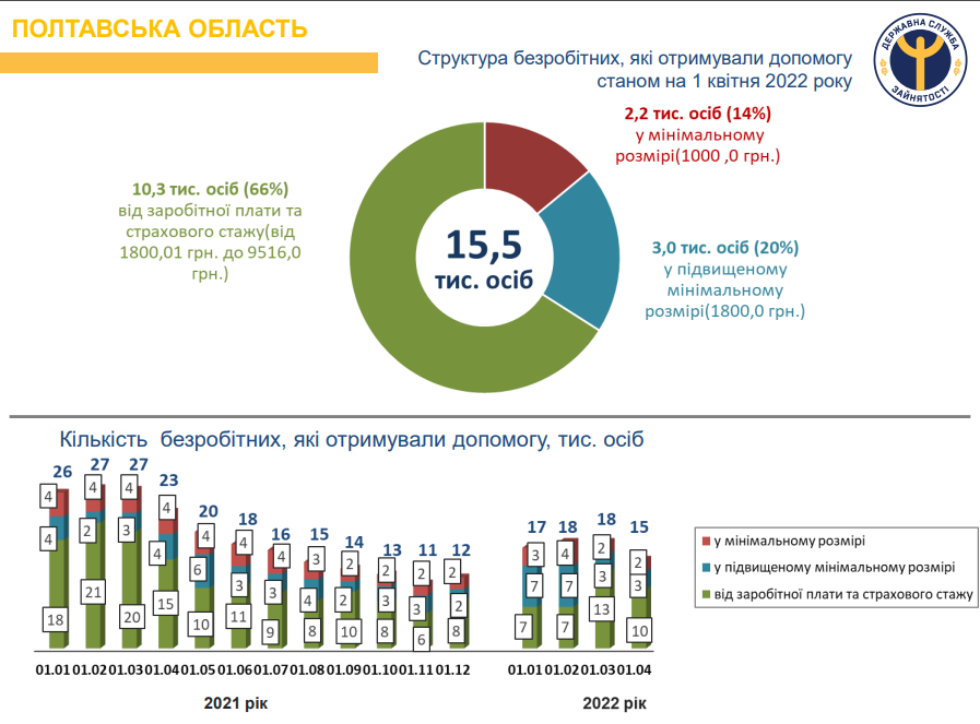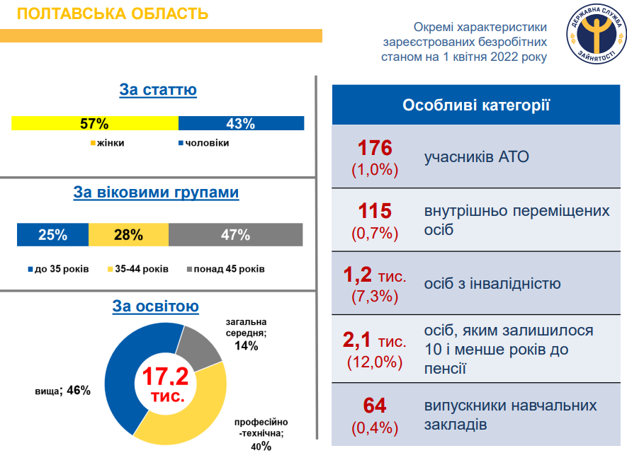 Станом на 1 квітня 2022 року послуги Полтавської обласної служби зайнятості отримували 17,1 тисячі осіб, які мали статус безробітного, це на 34% менше, ніж на відповідну дату минулого року.