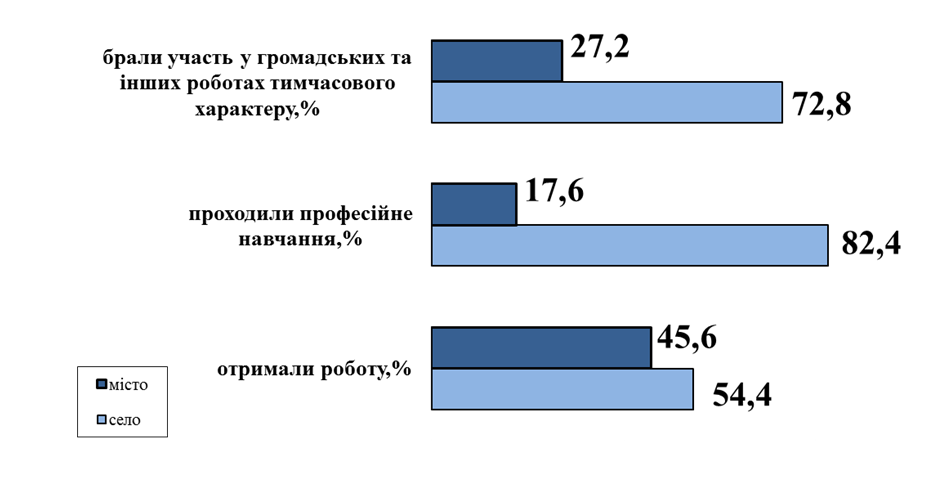 У січні-квітні 2020 року профорієнтаційні послугаи надані 27,8 тисячі осіб, які мали статус безробітного, зокрема 56,2% (15,6 тисячі) - з числа сільських мешканців та 43,8% (12,2 тисячі) проживають у місті.