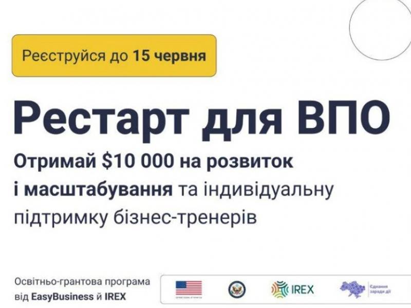IREX та ГО EasyBusiness, в межах програми «Єднання заради дії», запускають освітньо-грантову програму «Рестарт для ВПО». Реєструйся та отримай можливість виграти грант у розмірі 10 000$ на розвиток бізнесу та менторську підтримку від провідних бізнес-тренерів.