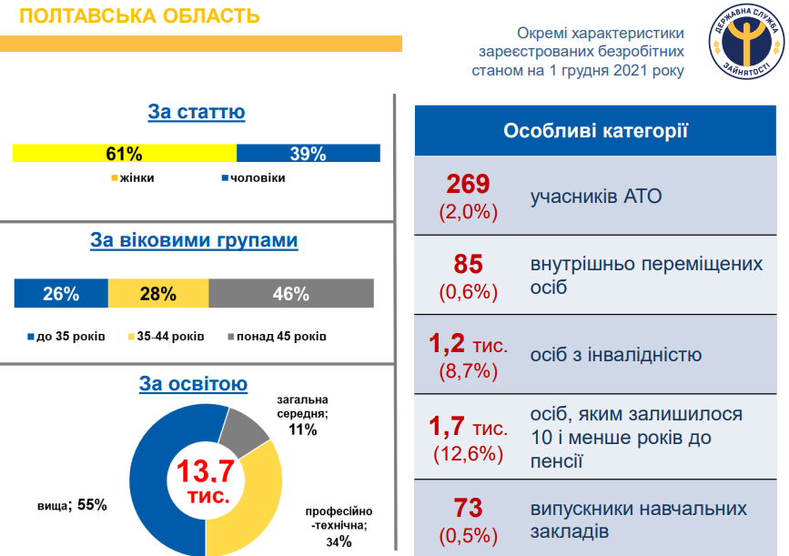 Станом на 1 грудня 2021 року послуги Полтавської обласної служби зайнятості отримували 13,7 тисячі осіб, які мали статус безробітного, що на 38% менше, ніж на відповідну дату минулого року.