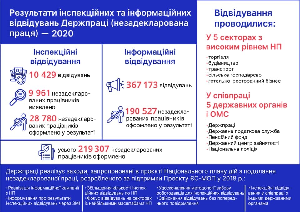У 2020 році інформування щодо легалізації зайнятості проводилося серед роботодавців і найманих працівників у сферах торгівлі, будівництва, транспорту, сільського господарства, готельно-ресторанного бізнесу.