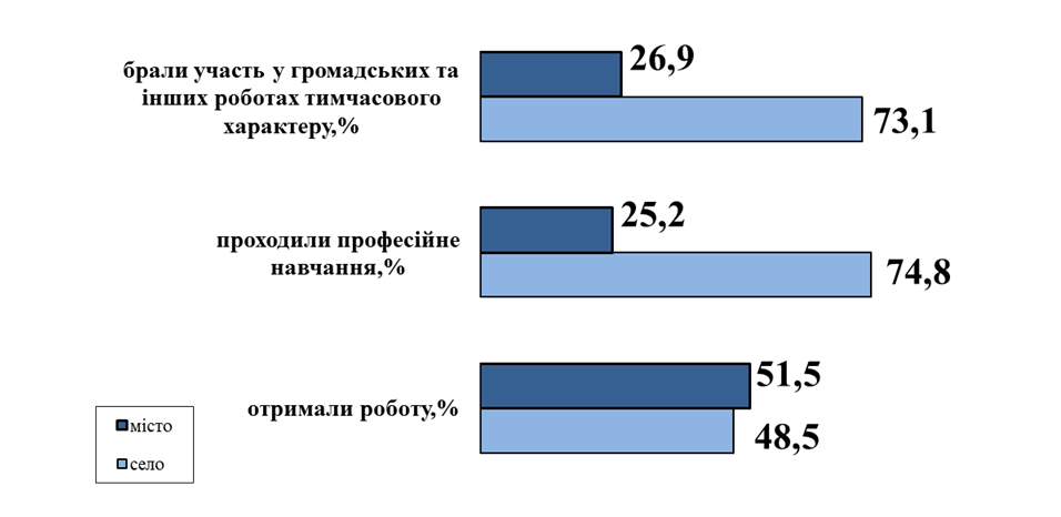 У січні-листопаді 2020 року профорієнтаційні послуги надані 46,6 тисячі осіб, які мали статус безробітного, зокрема 51,2% (23,9 тисячі осіб) з числа сільських мешканців та 48,8% (22,7 тисячі) проживають у місті.